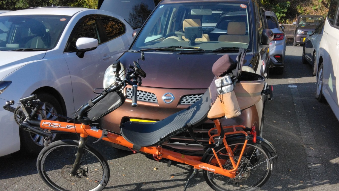 動画を見てもらえば分かるがCONGの両輪外してフレームのみ妻に輪行してもらった。フレームだけでも9㎏と今の基準ではメチャクチャ重たいが、ロードバイクよろしく車輪を括りつけたり折り畳み自転車でも固定器具なんて大したことないし普通の輪行だとどうしてもバタバタするので初心者は持ち運びしにくい。今回みたいにフレームだけならただのダイヤ型をした鉄パイプなので扱いやすく運びやすい由。まあまあ好評であった。